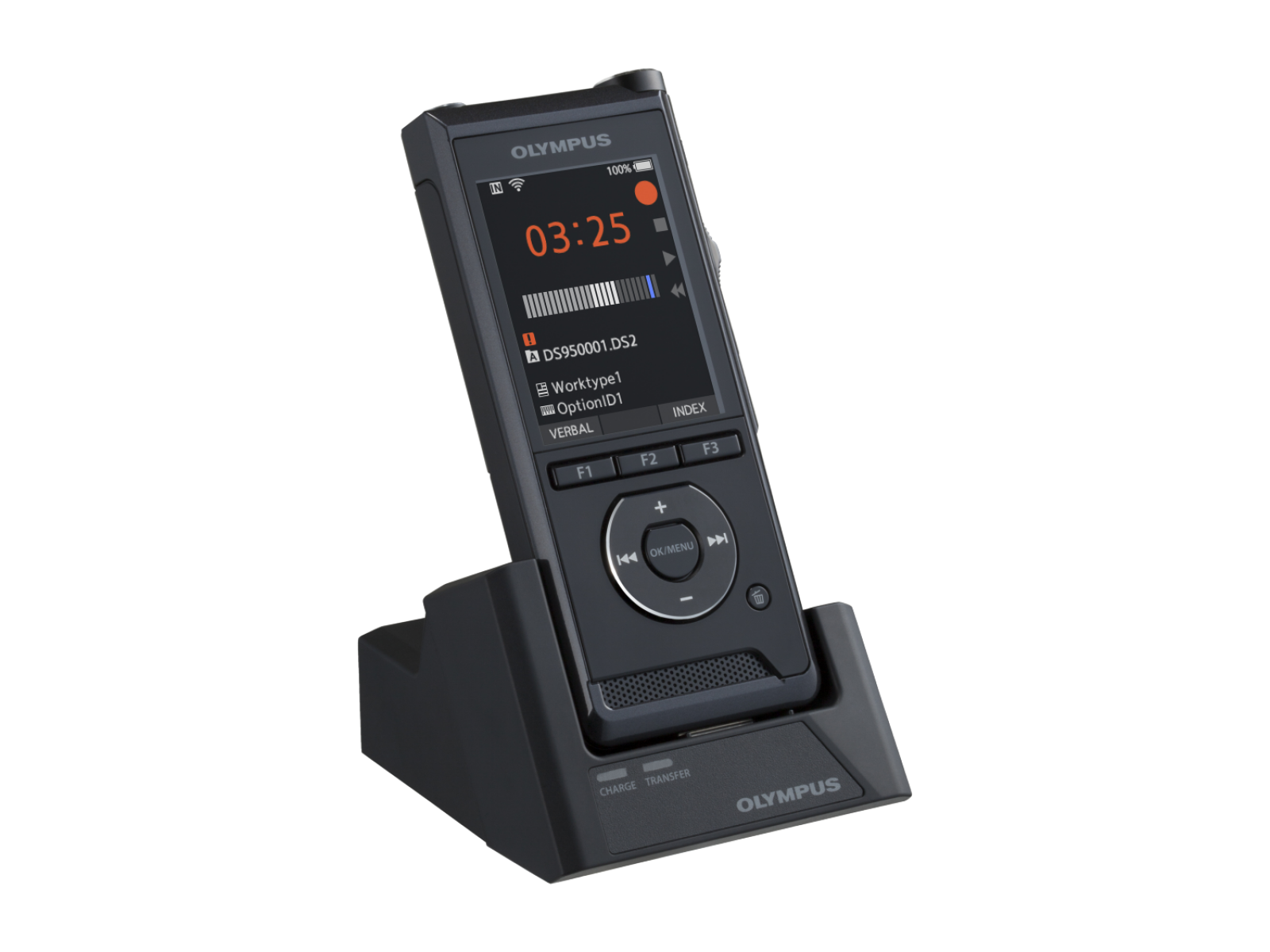 Une station d’accueil est livrée avec le dictaphone. Elle permet de transférer vos dictées depuis le dictaphone via USB ou LAN. Branchée à un adaptateur Olympus AC, elle recharge votre appareil en deux fois moins de temps qu’avec une connexion USB (USB : environ 4 heures). Elle permet également la connexion à une pédale de commande Olympus afin de contrôler à distance l’enregistrement ou l’écoute pour transcription en main libre.